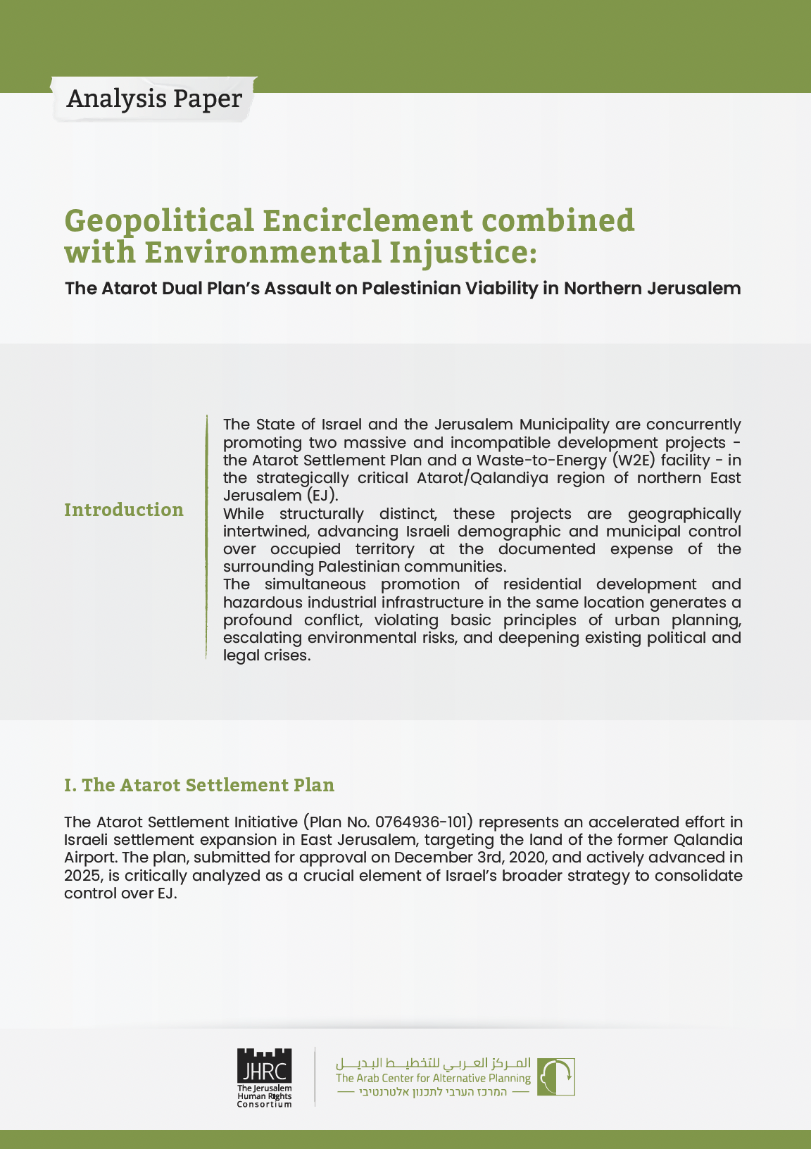 The State of Israel and the Jerusalem Municipality are concurrently promoting two massive and incompatible development projects - the Atarot Settlement Plan and a Waste-to-Energy (W2E) facility - in the strategically critical Atarot/Qalandiya region of northern East Jerusalem (EJ).