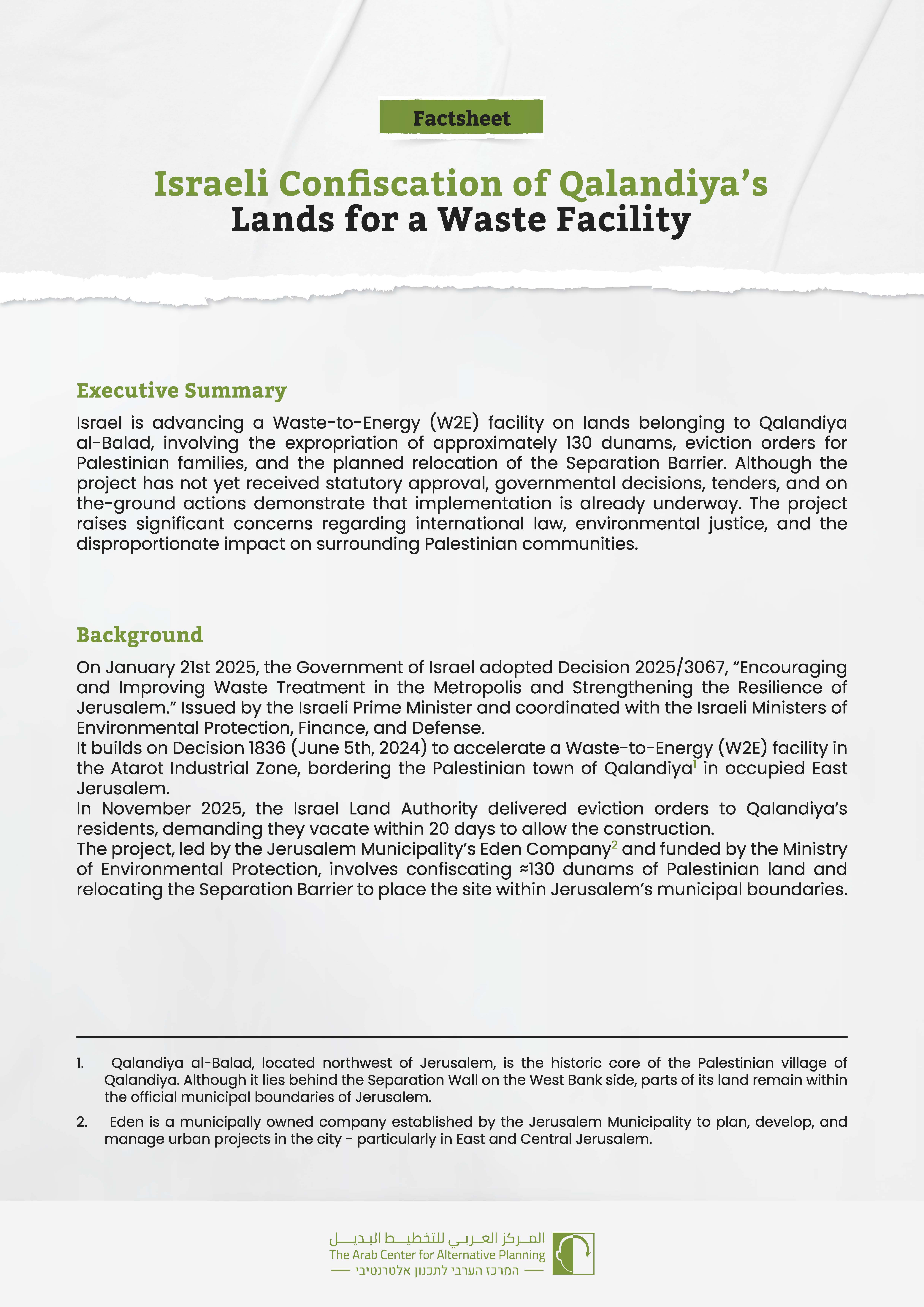Israel is advancing a Waste-to-Energy (W2E) facility on lands belonging to Qalandiya al-Balad, involving the expropriation of approximately 130 dunams, eviction orders for Palestinian families, and the planned relocation of the Separation Barrier. Although the project has not yet received statutory approval, governmental decisions, tenders, and on the-ground actions demonstrate that implementation is already underway. The project raises significant concerns regarding international law, environmental justice, and the disproportionate impact on surrounding Palestinian communities.